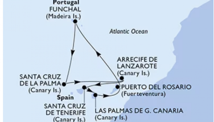 Zbor potnikov ob 5:00 na letališču Brnik. Prijava na let in letalski prevoz ob 6:30 v Zürich. Nadaljevanje leta ob 9:00 na TENERIFE in pristanek ob 13:50. Prevoz do pristanišča in vkrcanje na ladjo. |