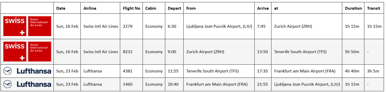 SANTA CRUZ – Tenerife Po izkrcanju transfer na letališče. Ob 11:55 let v Frankfurt in ob 20:40 nadaljevanje poleta v Ljubljano, kjer bomo pristali ob 21:55. |