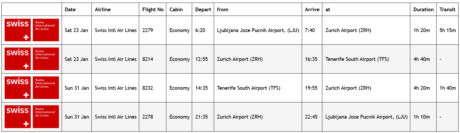 SANTA CRUZ – Tenerife Po izkrcanju transfer na letališče. Ob 14:35 let v Zürich in ob 21:35 nadaljevanje leta v Ljubljano, kjer bomo pristali ob 22:45. Zaključek potovanja. |